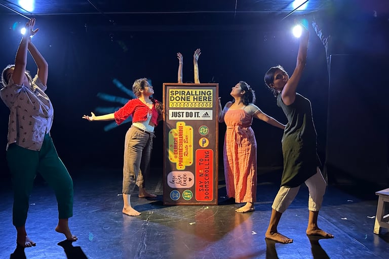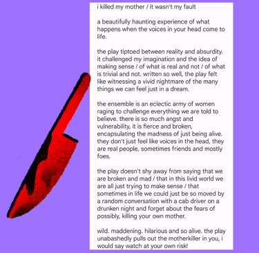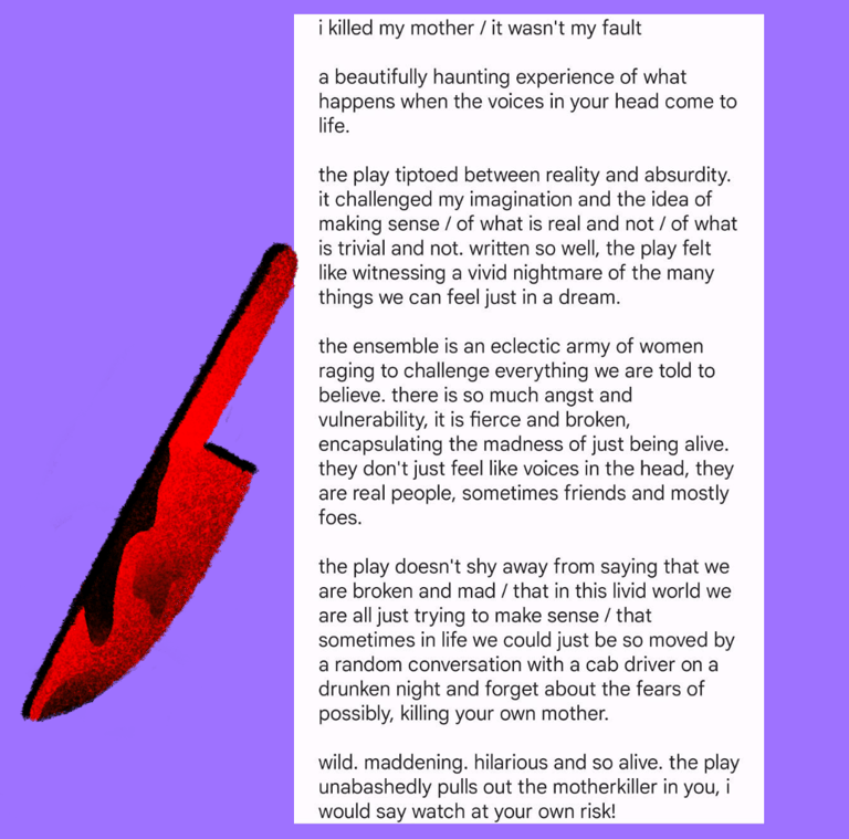 What followed was a lot of nudging and nagging from friends and family who believed in me when I wasn’t able to, some desperate attempts at changing careers, waves of a pandemic, and finally a push of self-assertion in the form of a grant from my alma mater, the Drama Schools Foundation Mumbai. What you see today is no longer just mine. I Killed my Mother / It Wasn’t my Fault belongs to everyone on stage and off who has contributed to its telling, it belongs to frivolous women, it belongs to this new generation of youth, and it belongs to you who are watching it today.