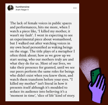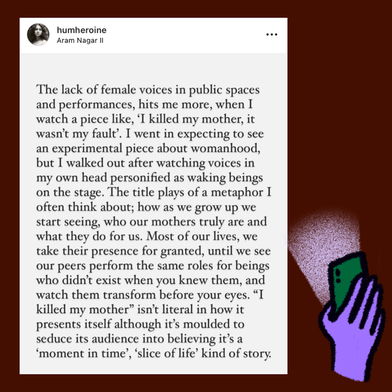 I Killed my Mother / It Wasn’t my Fault is my effort to depict life on a bad day. In 2019, a bad day to me meant my mother being annoyed with me for some mysterious reason that had to do with my daily habits, unemployment, not having the willpower to get off my phone, and feeling a heightened sense of loneliness. The idea began and grew from investigating what is The War with the Self, wanting to write longform stream-of-consciousness, and questioning class privilege in young, urban women like me. The idea then grew at Indian Ensemble’s First Draft: Ideas Lab, where Chanakya Vyas, Karen D’mello, Abhimanyu Acharya, and a most wonderful cohort of fellow writers, witnessed its first iterations.